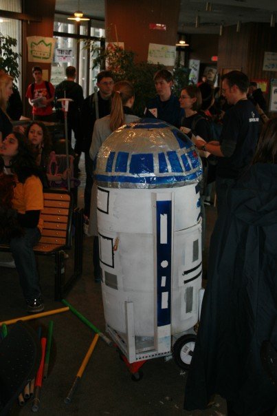 Project 0027 R2D2 is a remote-controlled robot that was used by the Electrical Engineering Students Society (ZOO) during Engineering Week 2007. Material was supplied by ZOO while design and shop assistance was provided by WC Projects under Project 0027. Upon completion, all documents and design rights were transferred to the Electrical Engineering Students Society in 2007. In 2008 ZOO began rebuild and redesign efforts.